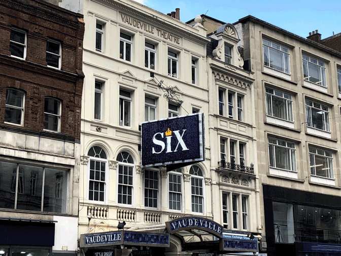 Six is at the Vaudeville Theatre in London. The Vaudeville Theatre is located on the Strand. It's close to West End theatres including the Savoy Theatre and the Adelphi Theatre.